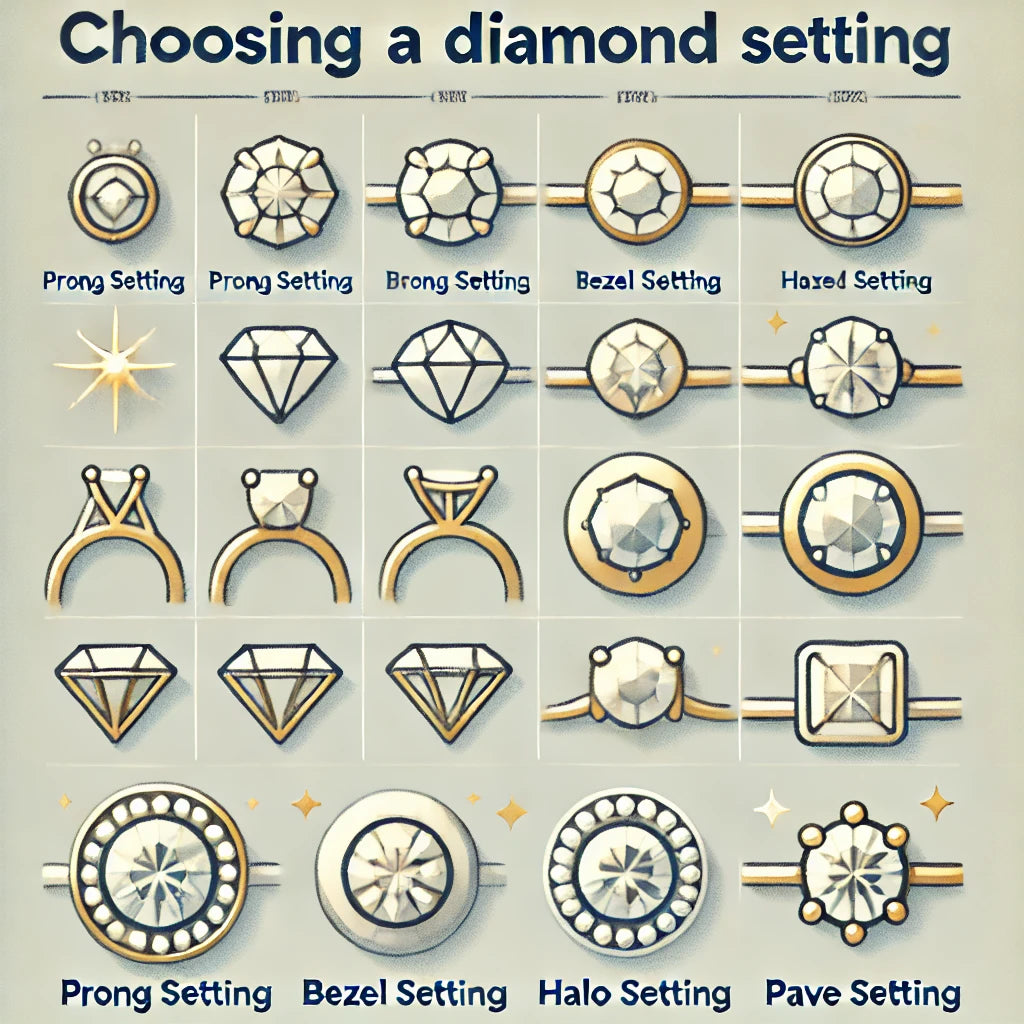- Prong Setting: Holds the diamond in place with four or six prongs, allowing maximum light to pass through the stone.