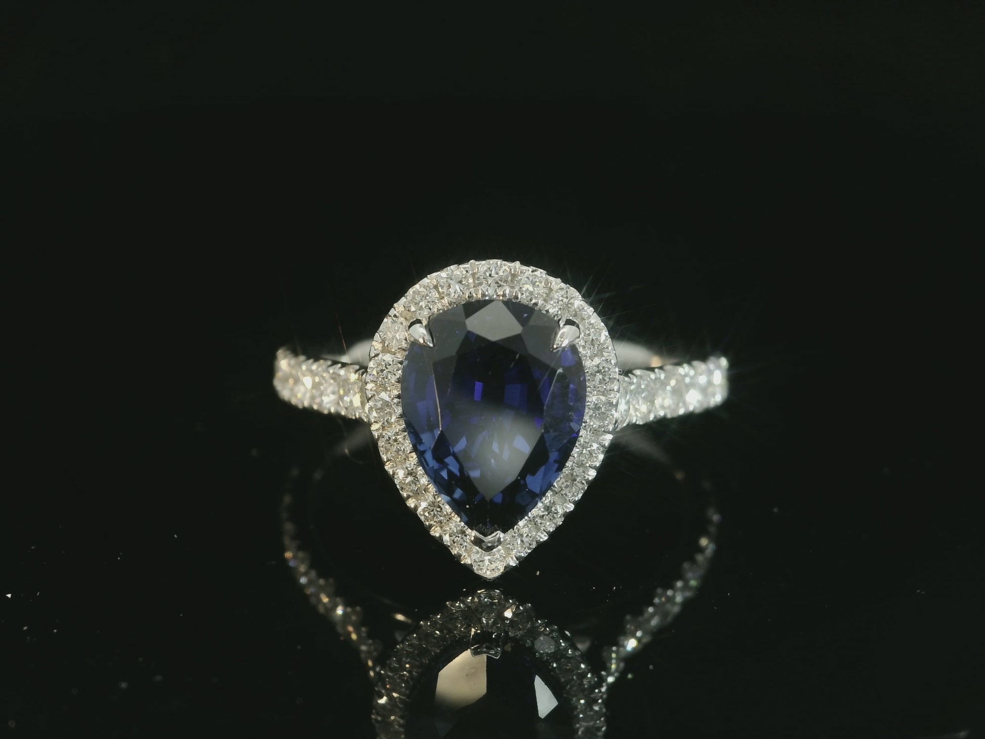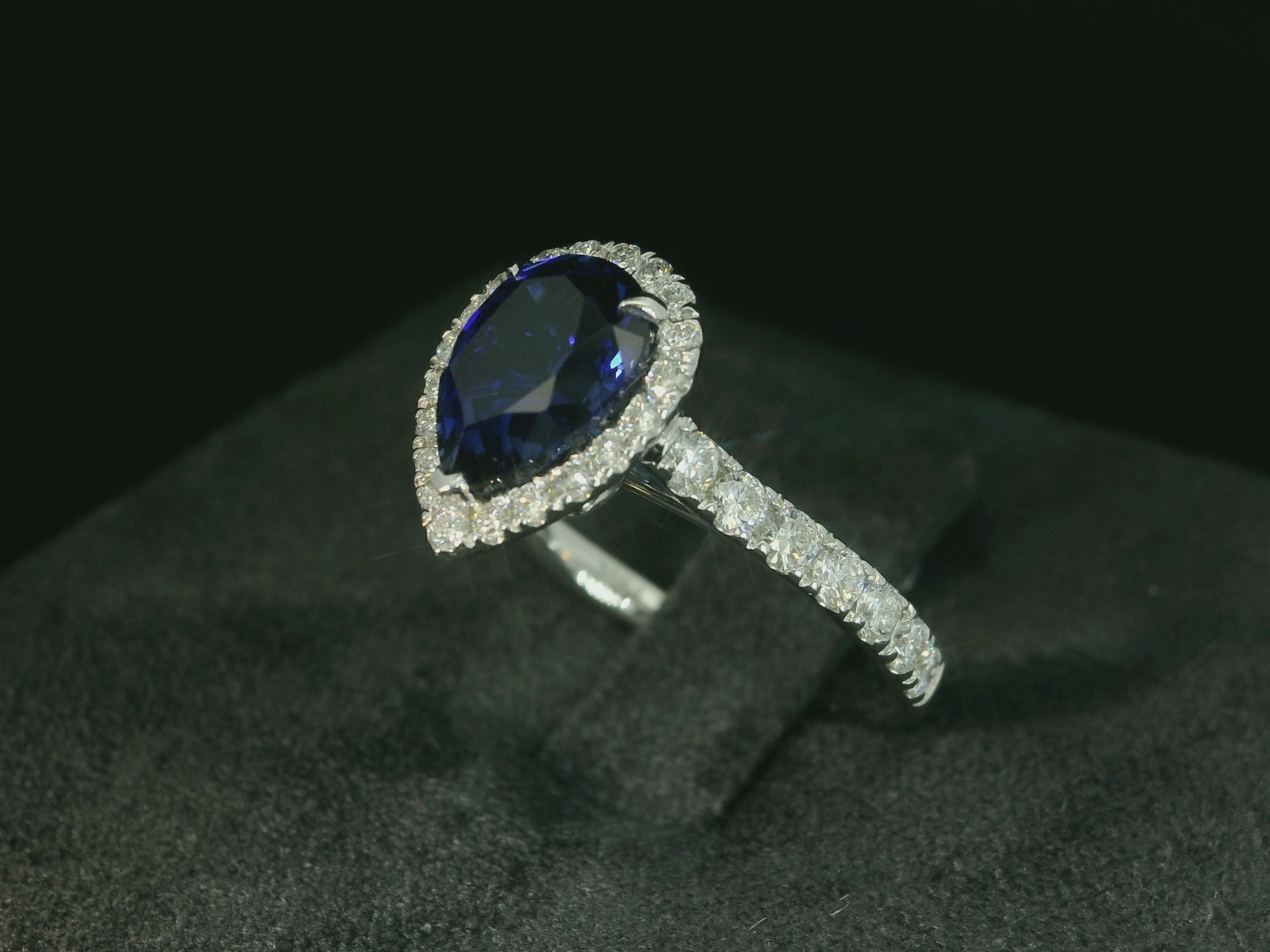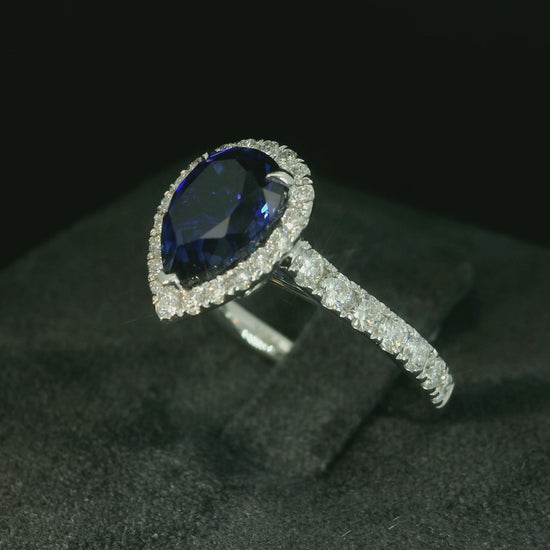 14K WHITE GOLD LAB BLUE SAPPHIRE PEAR SHAPE & LAB DIAMONDS RING