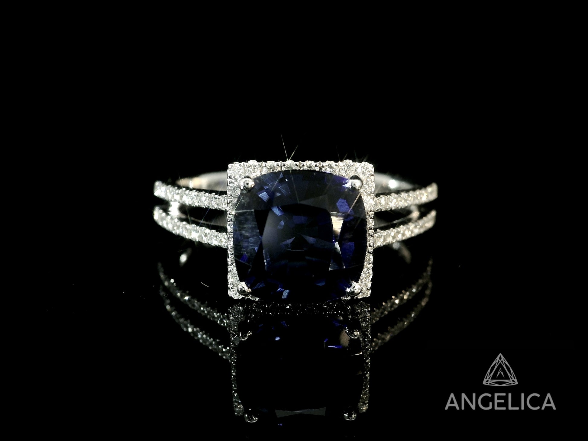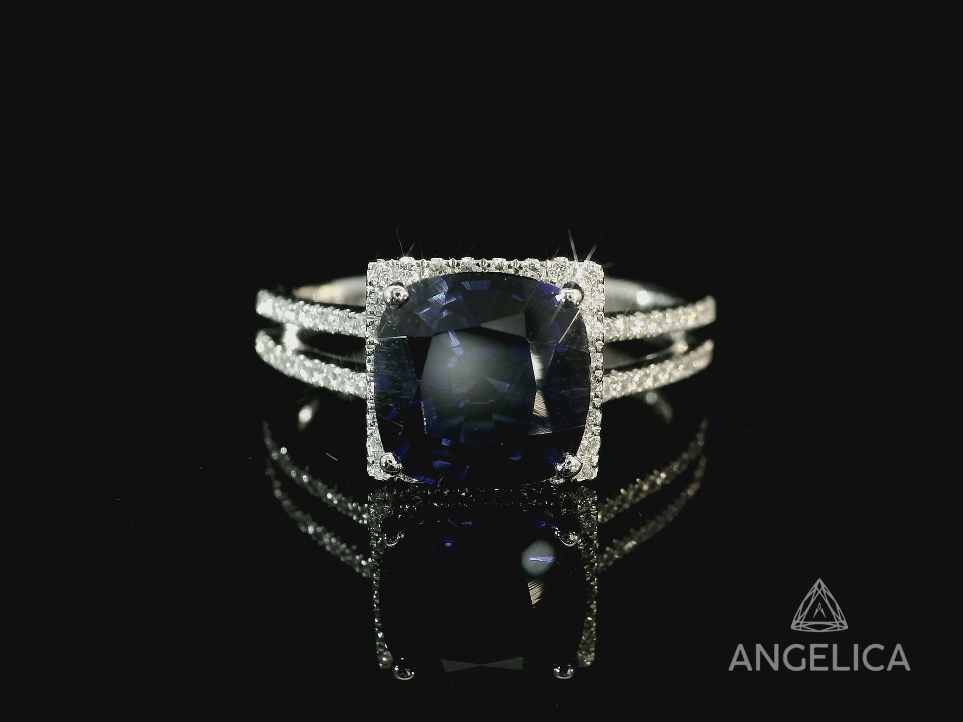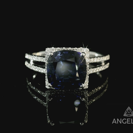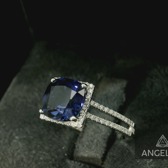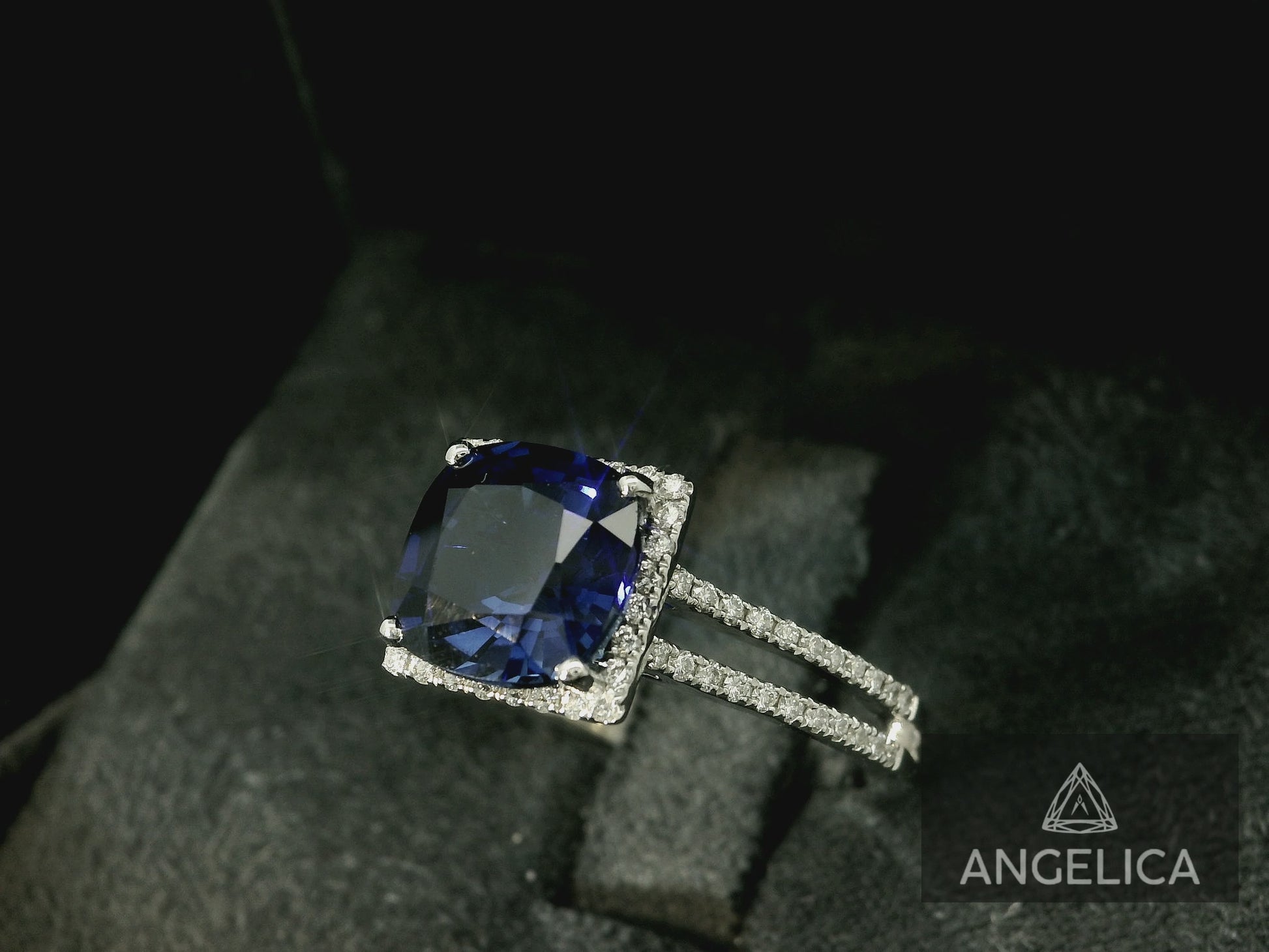 18K WHITE GOLD LAB BLUE SAPPHIRE CUSHION CUT & NATURAL DIAMONDS RING