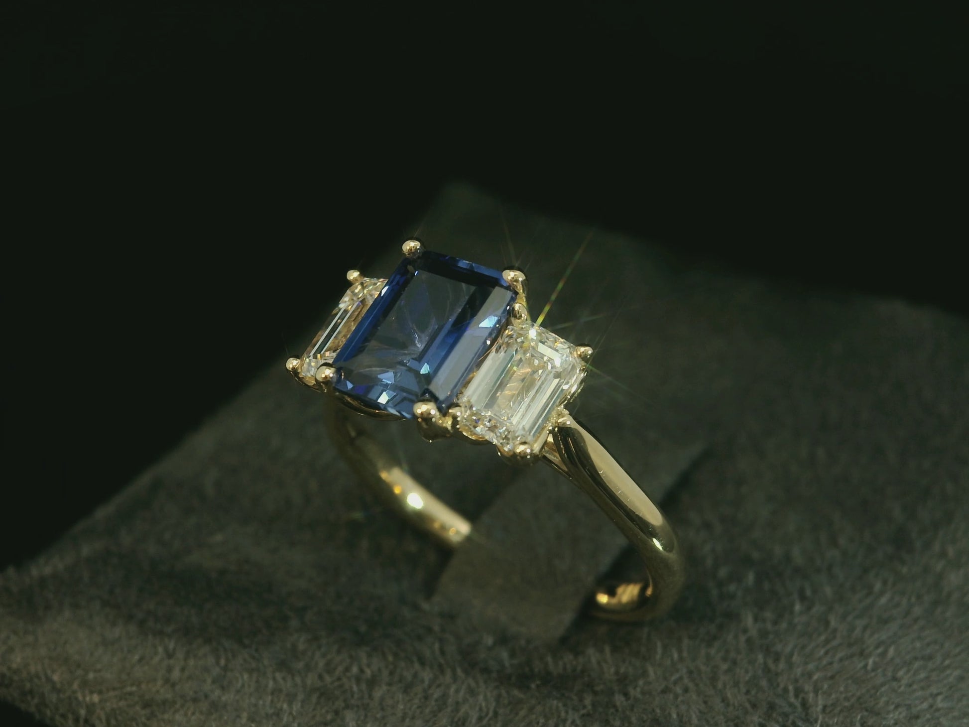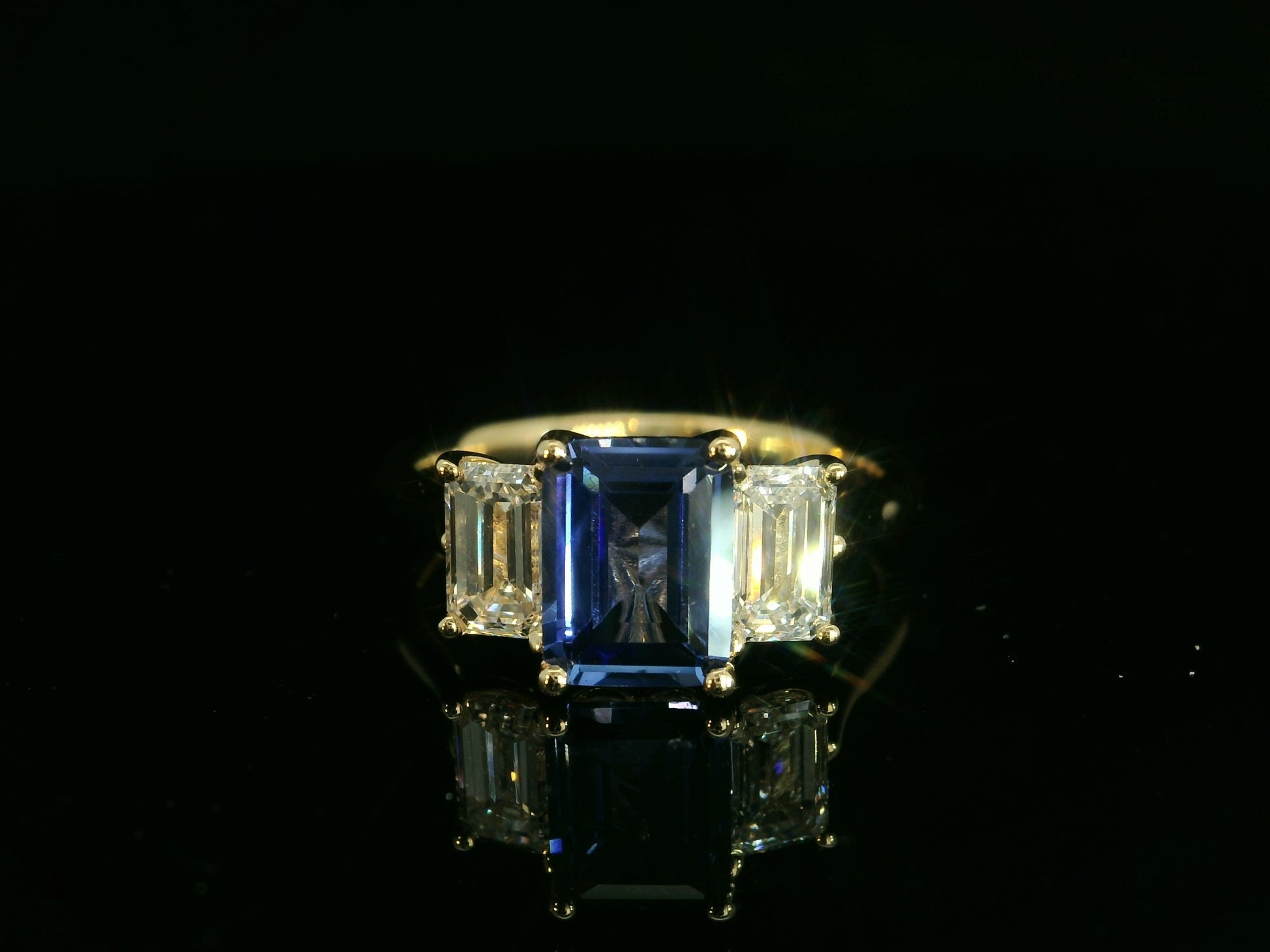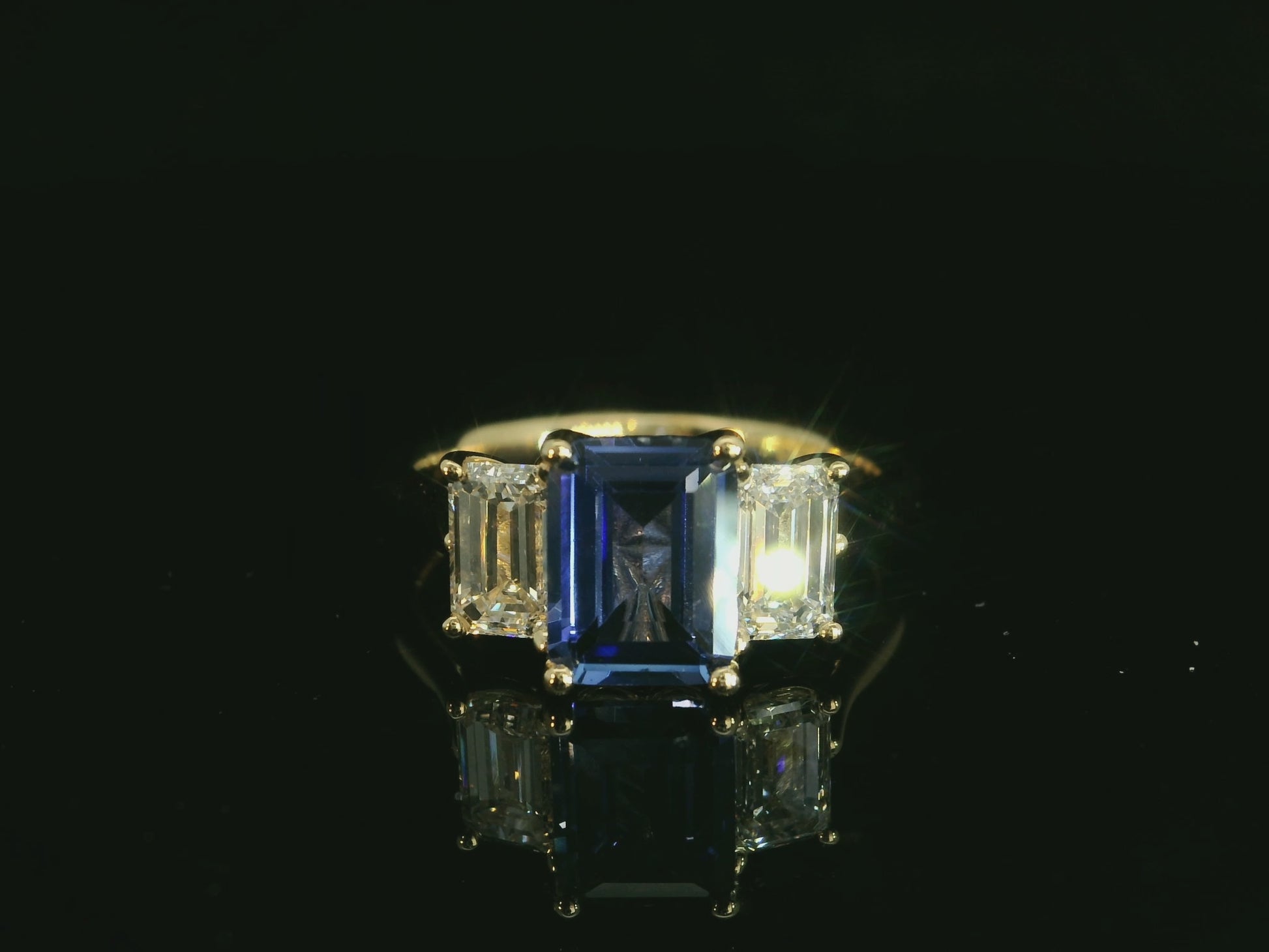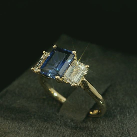 18K YELLOW GOLD LAB BLUE SAPPHIRE EMERALD CUT & LAB DIAMONDS RING