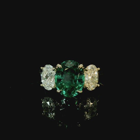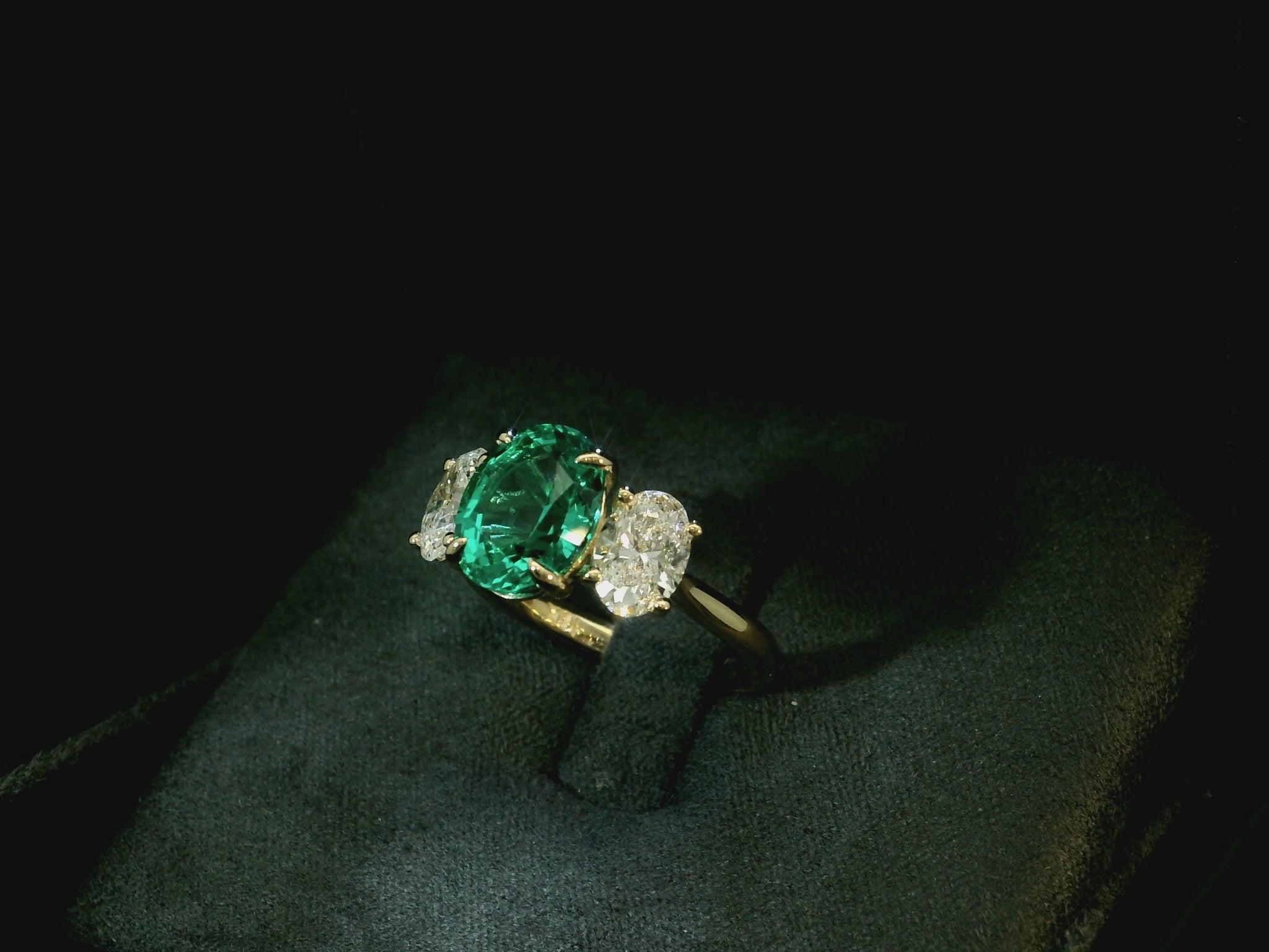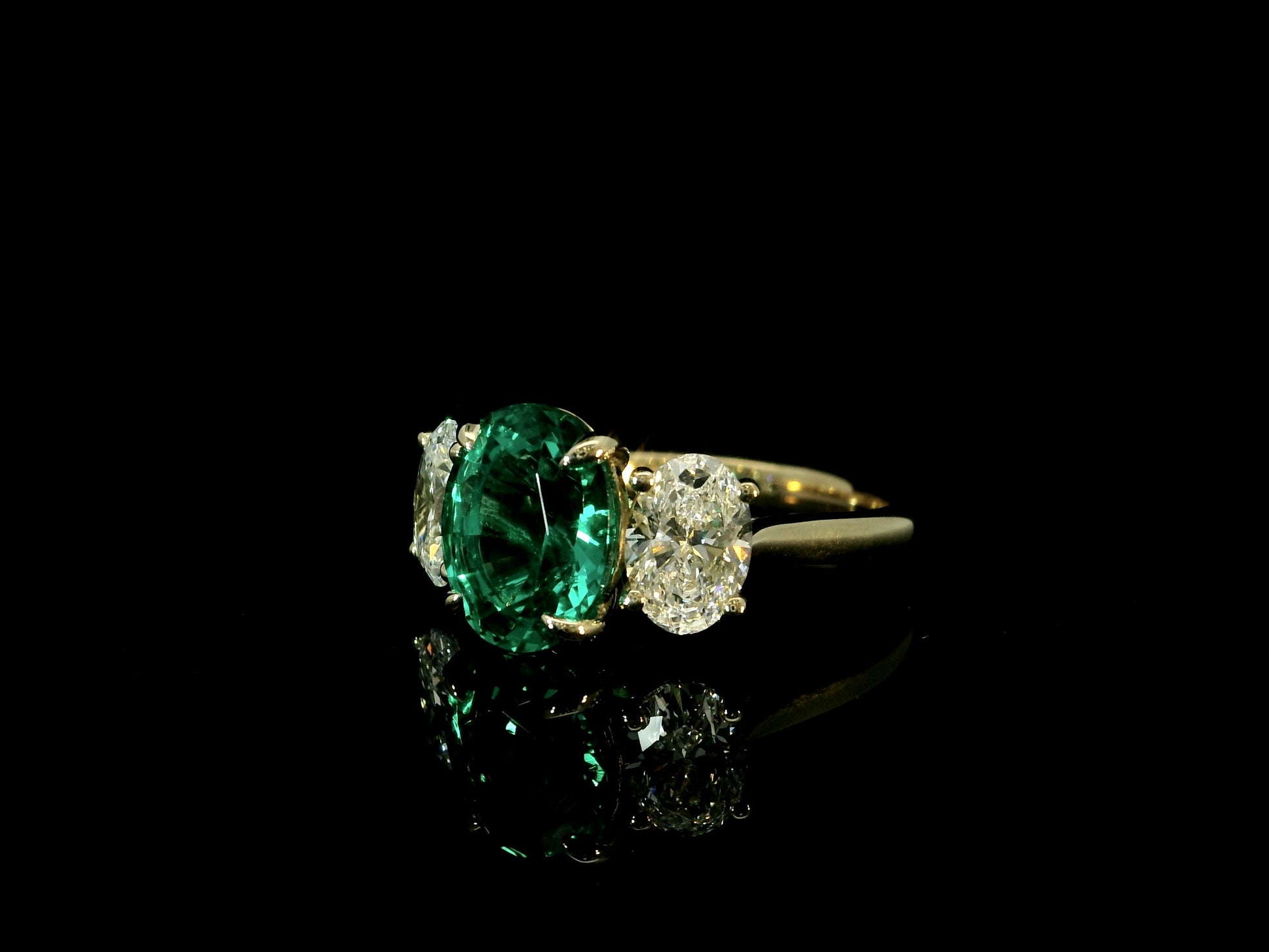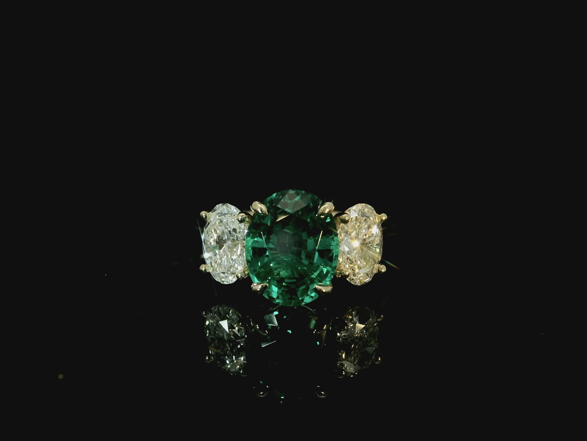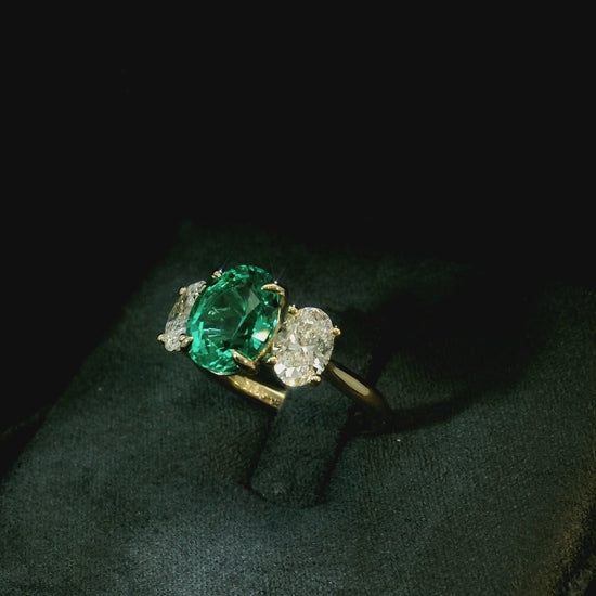 18K YELLOW GOLD LAB GREEN EMERALD EMERALD CUT AND OVAL DIAMONDS RING